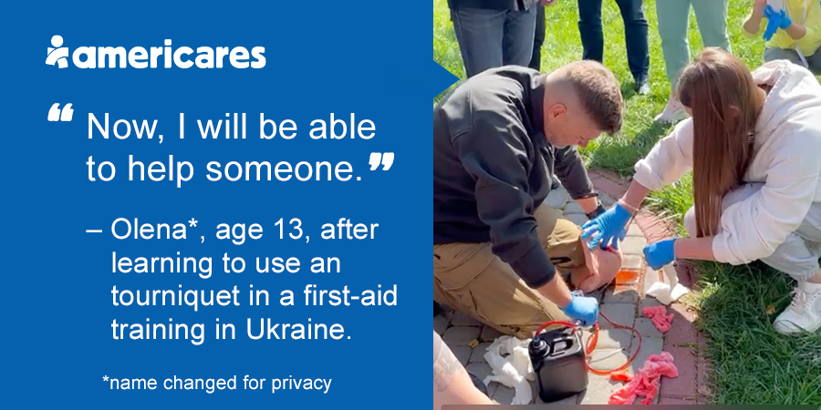 In late 2022, Americares provided the Poland-based Institute of Emergency Medicine with more than 10,000 tourniquets, used to stop the flow of blood to a limb or extremity in an emergency. Because the tourniquets were intended for civilians, Americares also provided two-day courses in emergency medicine, taught by certified trainers. The goal was to train 100 instructors who could, in turn, train and supply 10,000 civilians with tourniquets. By the end of December, IEM had trained more than 140 instructors in Lviv, Odesa and Uzghorod. Two of those are Natalia and her 13-year-old daughter, Olena*.