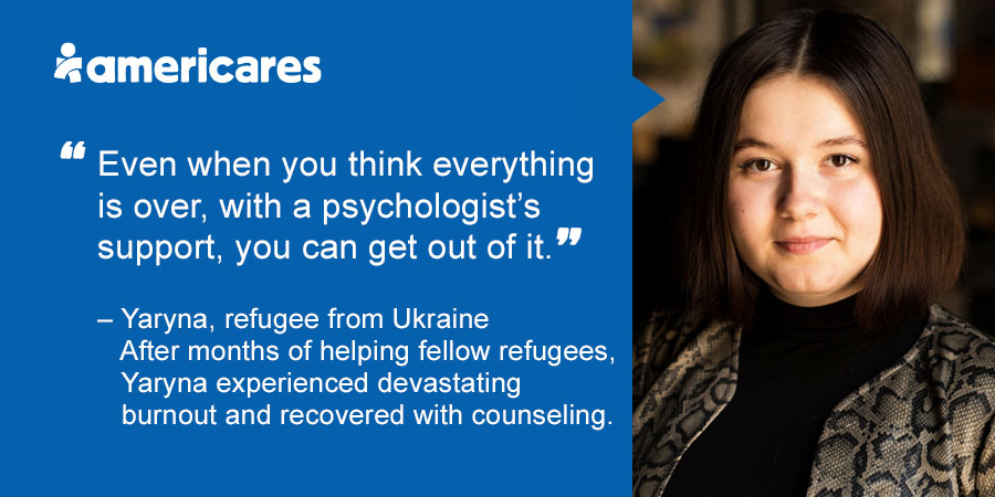 When 20-year-old Yaryna fled Ukraine in February 2022, driving her sister and family friends to Poland over three days in frigid temperatures, she had one goal: To bring everyone safely across the border. She did not know that her intense focus on that goal would be the first step to a debilitating burnout that threatened her own health and safety.