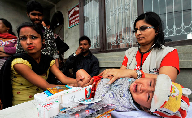 Earthquakes survivors in Nepal are at risk for many health problems, says AmeriCares Medical Officer Dr. Julie Varughese. Early on, thousands of survivors needed medical treatment for cuts, lacerations, crush injuries and broken bones due to collapsing buildings and falling debris. In the following days and weeks, survivors suffer from wound infections and respiratory problems from inhaling dust. With disrupted water supplies and sanitation problems, survivors can become ill from drinking unclean water. The most vulnerable people – older people and young children, for example—are at risk for illness from exposure to changing weather conditions as well as overcrowding; tens of thousands of survivors are living in tents in Kathmandu as well as in any kind of makeshift shelter in outlying communities, either because their homes were destroyed or damaged or very real threats from continuing aftershocks.