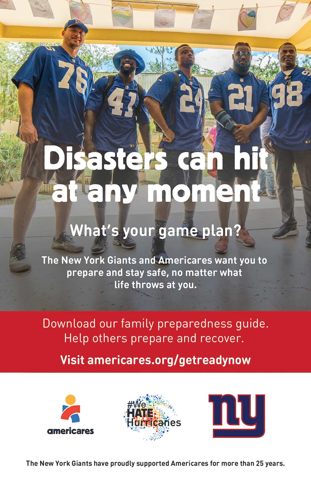 The New York Giants, which sent a contingent of current and former players to volunteer with Americares in Puerto Rico last spring, will raise awareness about the need to prepare in advance of disasters through a video PSA, print ad and social media posts during home games tonight, Sept. 9 and Sept. 30.