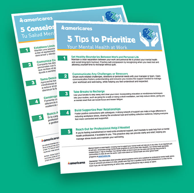 Knowing how to support your mental health will help you in any crisis. It’s an important part of self care. Here are some tips our specialists provide to communities in crisis all over the world